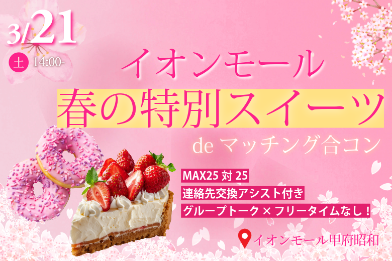【男性23~32歳、女性22~32歳】1対1トーク限定!イオンモール春の特別スイーツdeマッチング合コン|3月21日(土)13:30~