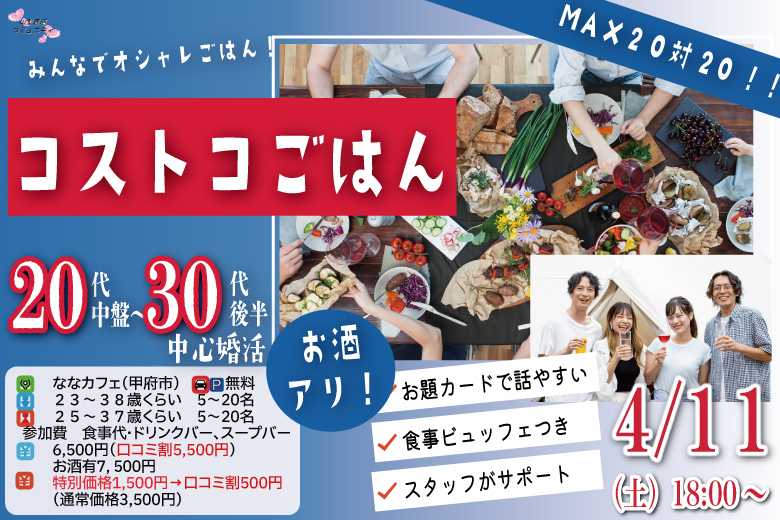 MAX20人対20人最大40人!コストコご飯&デザート!街コン風巨大合コン(お酒有)