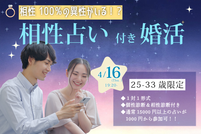 4月16日(木)19時20分から、相性診断付き1on1マッチングを開催します。