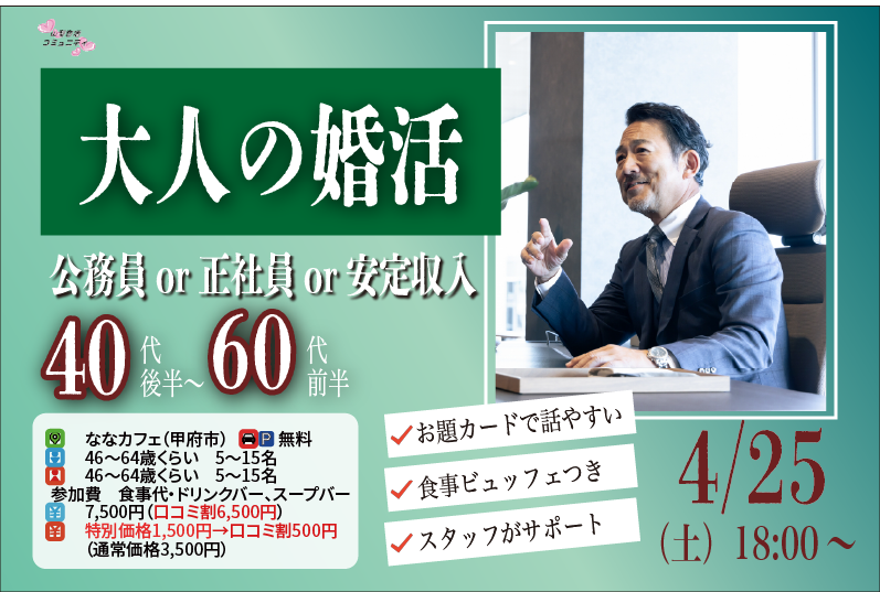 【4/25(土)18:00~】安定収入男性to婚活|40代後半50代60代前半中心
