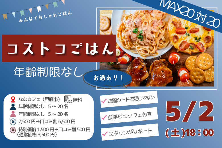 【甲府市】MAX20対20|コストコご飯&デザート!街コン風巨大合コン|5/2(土)18:00~
