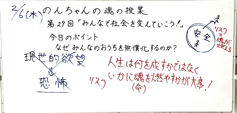 無償化すると覚悟を決めてから、私自身変化がありました。恐怖心が無くなったのです。以前は常に恐怖心があってみんなのおうちの活動を純粋に楽しめませんでした。常に頭のどこかでお金の計算をしている自分がいたのです。「うまくいきたい」「早く黒字化したい」「生徒を増やさなければ」という欲が恐怖の要因だったのです。「成功したい」「金持ちになりたい」「人に認められたい」といった現世的欲望が恐怖を生むのですね。極端な例えをするならば、私は死んでもいいと思っています。全てを失っても構いません。人生の価値は、何を成したかという結果ではなく、いかに魂(命)を燃やしたかという過程にあるのでしょう。出来るかどうかはどうでもいい。失敗したって構わない。心の奥底から込み上げてくる想いに突き動かされるまま、魂を燃やして生きることにこそ価値があるのです。そして、魂を燃やす燃料となるのがリスクです。安全圏にいる限り魂は燃えてこない。心底から込み上げてくる想いがあるならば、リスクを覚悟の上で安全圏を飛び出さなければならない。その時、私達の魂は燃え始めるのです。