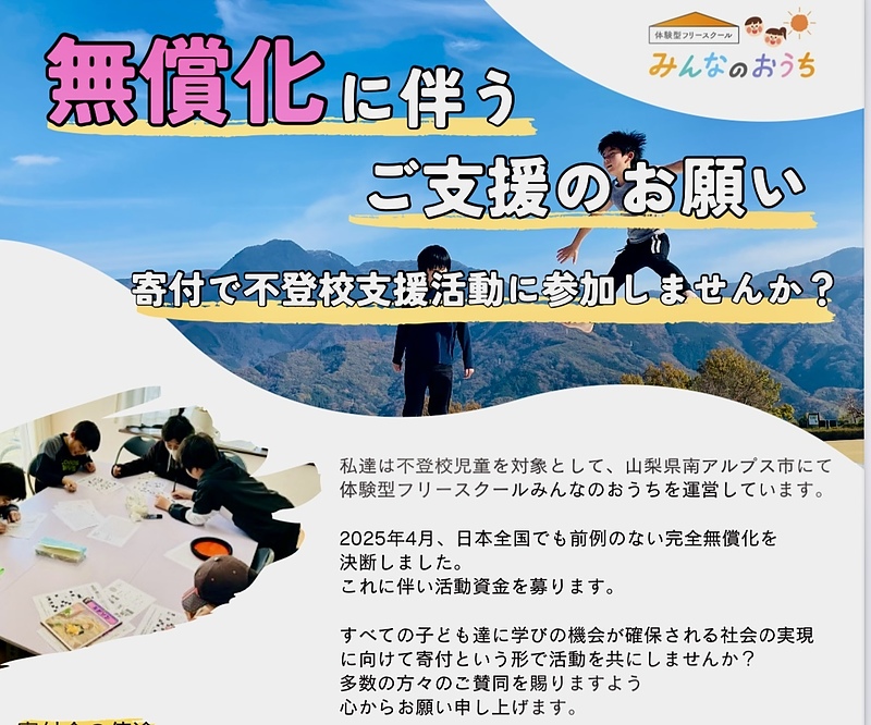 既に告知しました通り、2025年4月、日本全国でも前例のない完全無償化を決断しました。これに伴いフリースクールの活動資金を募ります。