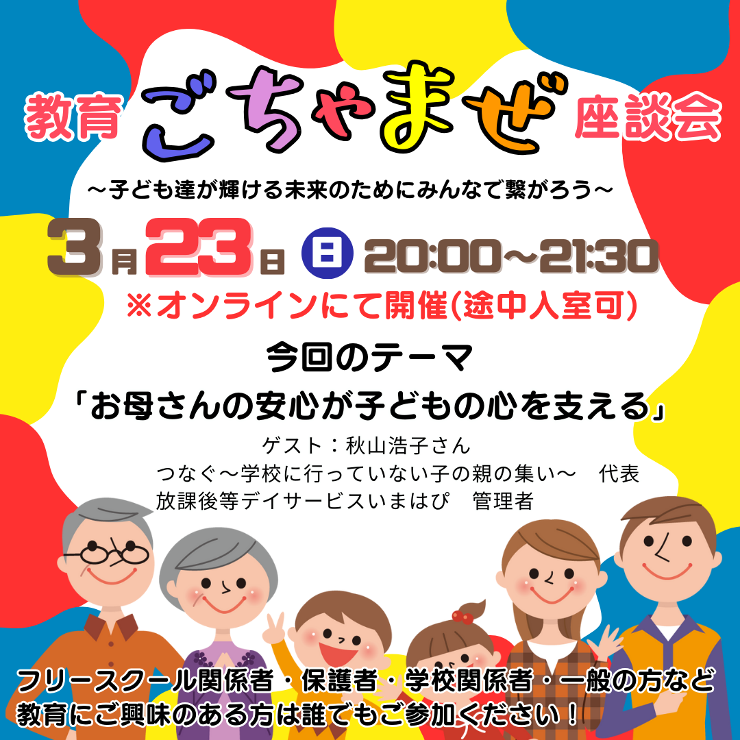 そこで!『教育ごちゃまぜ座談会』を始めることにしました!この会は、上述の通り教育や子どもたちに関係する方々が各々の立場の垣根を越え、ごちゃまぜになって議論する場です。せっかくならば日本全国の同志と繋がりたいという想いからオンライン開催としました。第9回目となる今回のテーマは「お母さんの安心が子どもの心を支える」です。つなぐ〜学校に行っていない子の親の集い@南アルプス〜の代表であり、放課後等デイサービスいまはぴの管理者、保育士でもある秋山浩子さんをゲストにお迎えして、親の安心感がいかに子どもの安心感に繋がるのか。将来を思うあまり、つい子どもを追い詰めてしまうことは少なくありませんが、伝え方を変えるだけで親子関係は大きく変わるもの。不登校や時代の変化に触れながら、親が心を整えることの大切さについてお話し頂きます。その後、参加者全員でディスカッションを行い、意見交換を通して、それぞれの立場で出来るより良い子どもとの関わり方について考える時間にしたいと思います。