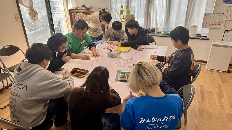 そこで閃きました。学びの本来の姿に立ち返ろうと。みんなのおうちならそれが出来るはずです。学ぶことの楽しさを子ども達に知ってもらおう。ワクワクしながら知識を体得してほしいとの思いから「わくわくタイム」と名付けたこの時間は、今では殆どの子達が進んで参加。みんな夢中になって楽しそうに学んでいます。今日はスタッフのこうちゃんが考案したオリジナル教材「漢字かるた」に取り組みました。ゲーム感覚で漢字が学べるこの教材を使うと、子ども達は驚異的な速さで漢字を習得していきます。他にも、算数に取り組む子がいたり、英単語を学んでいる子がいたり。異年齢の子達ですし、学びのペースも様々ですが、みんな楽しそうに取り組んででいます。こうして学びの楽しさを知った彼らは、きっと自ら学ぶようになっていくことでしょう。勉強すらワクワク楽しい時間になってしまう。これこそみんなのおうちだから出来る勉強法ですね!