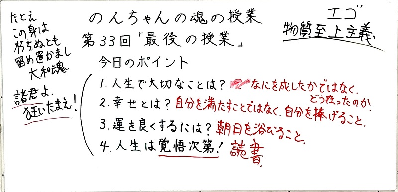 こうして最後の授業は終了しました。魂の授業は100回コースです。生きていたら(笑)、来月以降も継続していきたいと思います。この授業が、子ども達の幸せな人生の一助となれば幸いです。