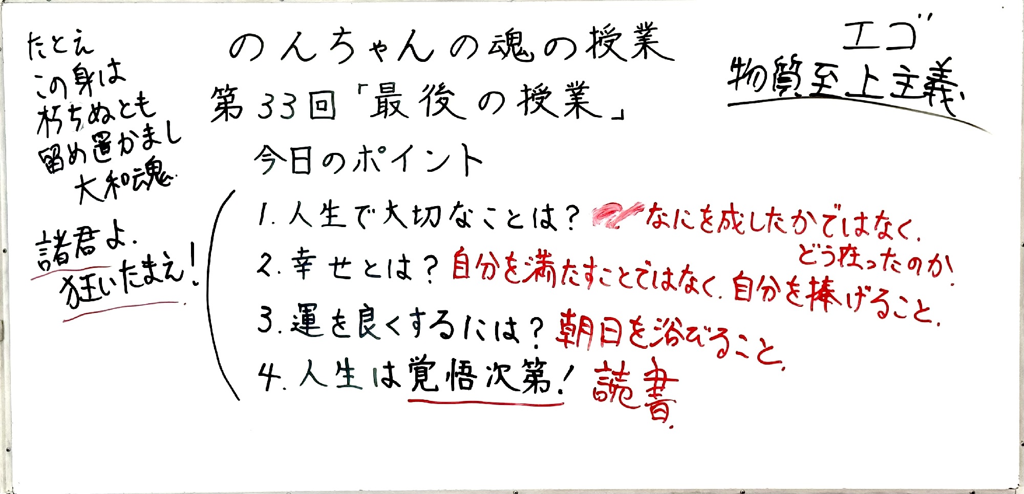 私達の命は有限です。それはいつ終わるとも知れません。ひょっとしたらこれが最後の授業になるかもしれない。確かなことはその可能性はゼロではないということ。ならば、私は子ども達に何を伝えたいのか。これが最後の授業になるならば、何と言葉をかけたいのか。彼らに最後の言葉を遺しておきたい。そのような主旨から、今日はこの授業が終わった時に私の人生も終わるという前提で最後の授業を行いました。