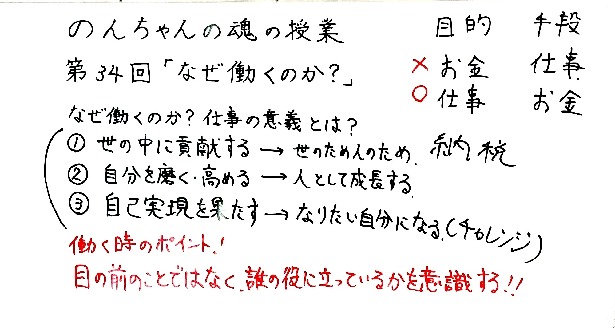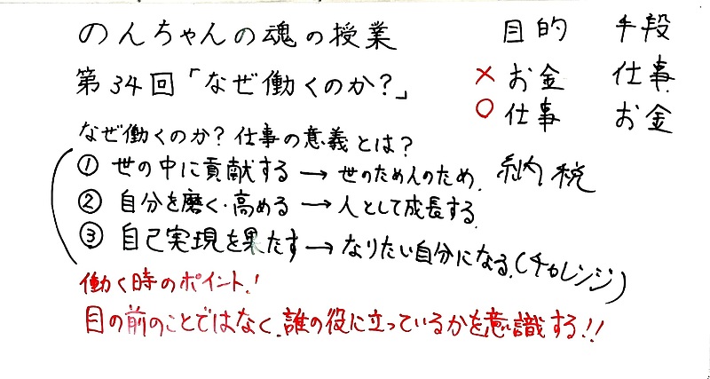 そこで今日は「おとな学」の前段階として「なぜ働くのか?」を子ども達に伝えました。恥ずかしながら私は、社会人になって働き始めた時、お金のために働くのだと思っていました。つまり、お金を稼ぐための手段として働くのだと思っていたのです。すると、仕事が全然楽しくありませんでしたし、創意工夫する気にもなれませんでした。そしてある時に気づいたのです。お金は目的ではなく手段に過ぎないのだと。つまり、働く目的はお金を得ることではない。あくまでもお金は手段であって目的ではないのです。そのことを教わらなかったら、子ども達もかつての私と同様に手段と目的をはき違えてしまうかもしれません。そうならないように今回はこのテーマを取り上げることにしました。