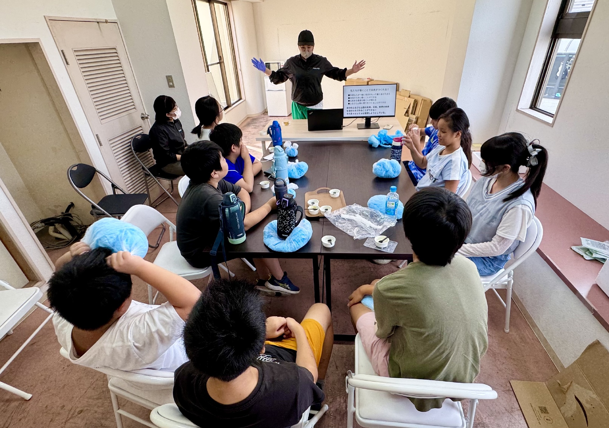 その後はいよいよ職場体験。干し芋の製造工程を体験させていただきました。サツマイモの皮を剥いて、専用の機械でスライスしたものを並べていくという重要な工程です。おとな学も4回目となり、このプログラムの意図をしっかり理解してきている子どもたちは真剣そのもの。この時間は他のスタッフさんと同じプロという意識を持って仕事に取り組んでいました。