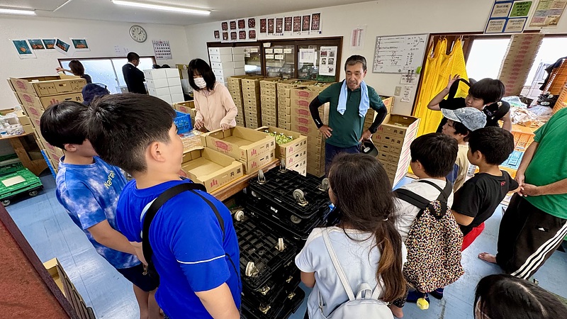 その後は作業場に移動して、シャインマスカットの出荷作業を見学。最盛期である現在は、毎朝2,000房を収穫し、その日のうちに出荷までされるそうです。それから代表の飯野公一さんにどうしてこの仕事をされているのか、この仕事のやり甲斐や大変なことなどをお話しいただきました。その中で「みんなで仕事をするのが楽しい」という飯野さんが本当に楽しそうなのが印象的でした。法人化して25年。会社を長く継続できた秘訣は人とのご縁だそうです。やはり人を大事にすることが事業発展には欠かせないのですね。この時間が子どもたちにとって仕事の意義を考える契機となれば本望です。M.A.C.Orchardさんには繁忙期であるにも関わらず、子どもたちのために貴重な時間を割いていただき心より感謝申し上げます。