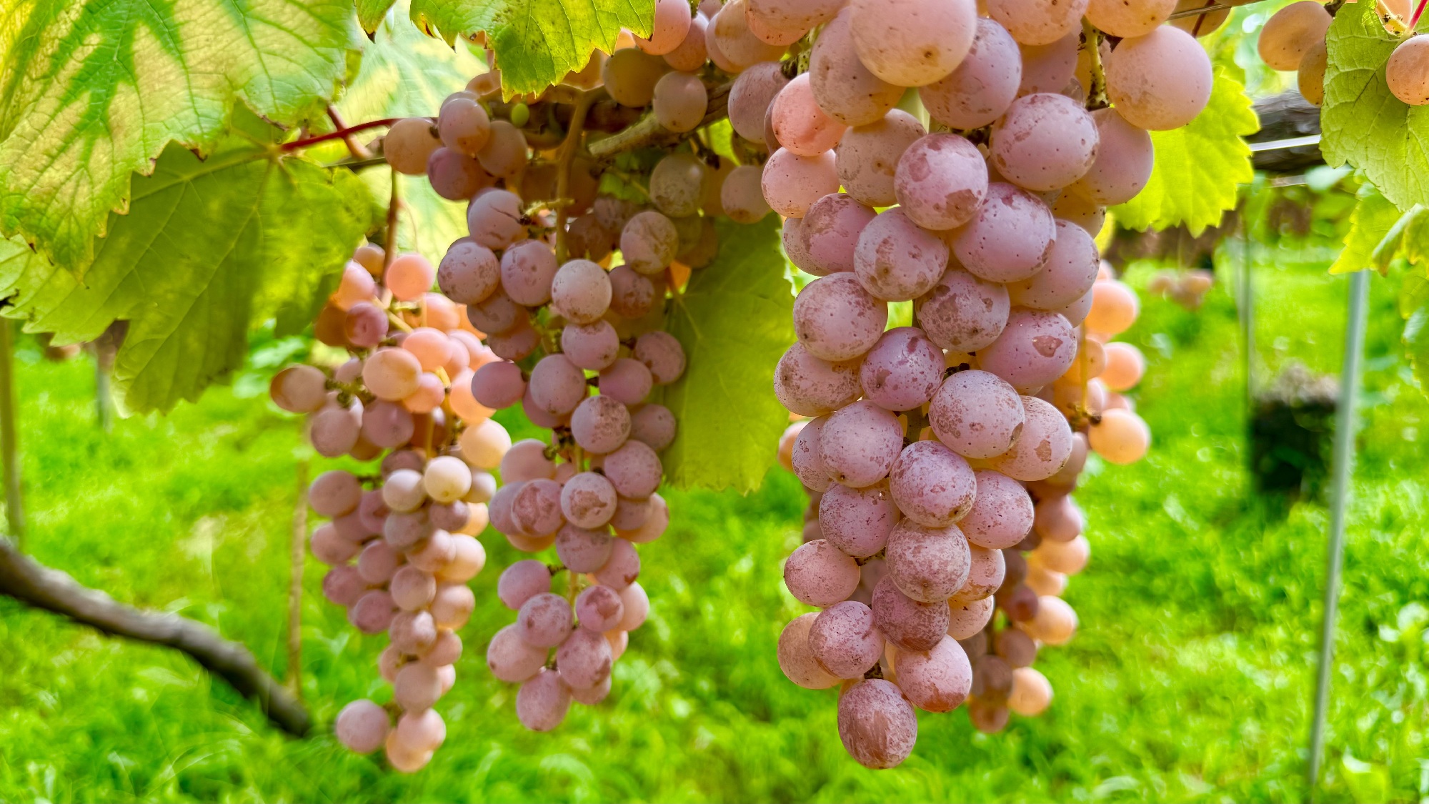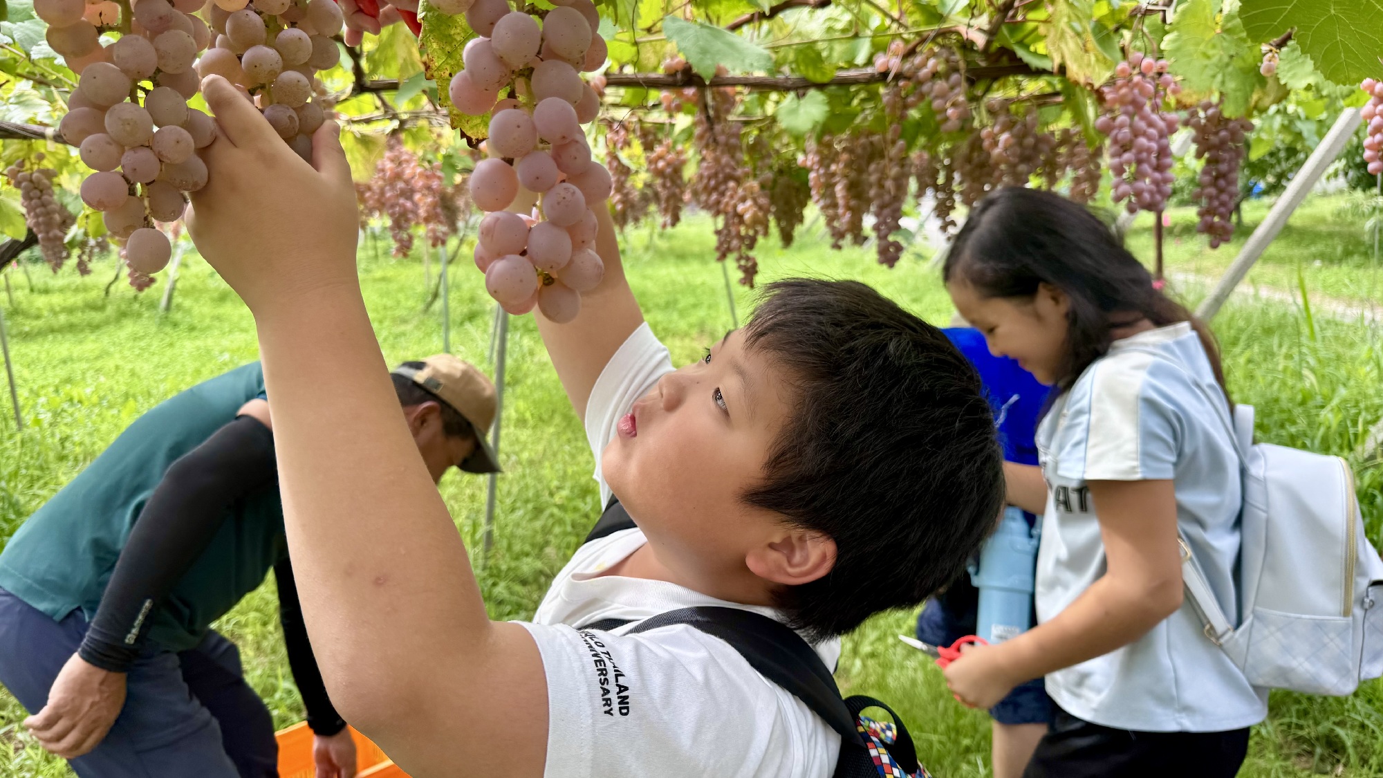 まずは甲州ブドウの収穫体験。甲州ブドウは山梨に伝わって約700年にもなる最も歴史の古いブドウでワインの原料になるそうです。子どもたちは汗だくになりながら収穫体験を楽しんでいました。