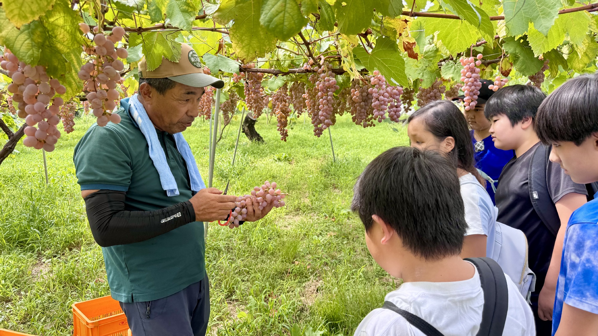 5回目となる今回は地元南アルプス市の農業生産法人M.A.C.Orchard社を訪問。同社は「安心で安全な果物をつくる」を経営理念に掲げ、桃・ブドウ・柿など環境に配慮した大規模面積の果樹栽培を行なっており、今年1月には日本農業賞において最高賞となる大賞を受賞されています。シャインマスカットの最盛期で慌ただしくされているにも関わらず、子どもたちを温かく迎えていただきました。