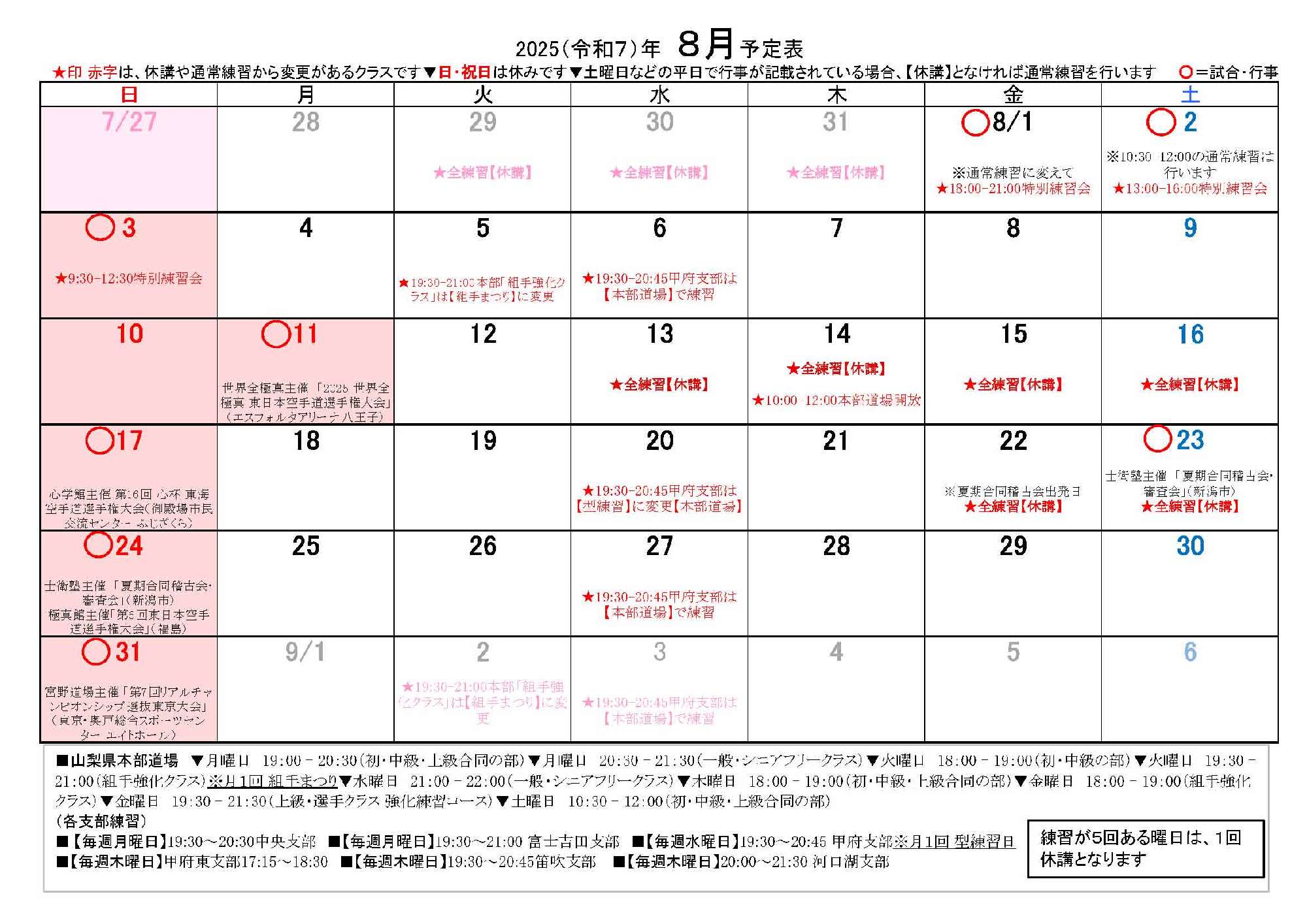 ◆◆◆ 士衛塾山梨の全道場の練習日程 ◆◆◆