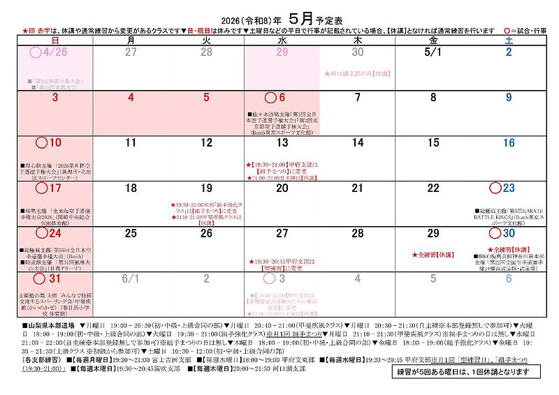◆◆◆ 士衛塾山梨の全道場の練習日程 ◆◆◆
