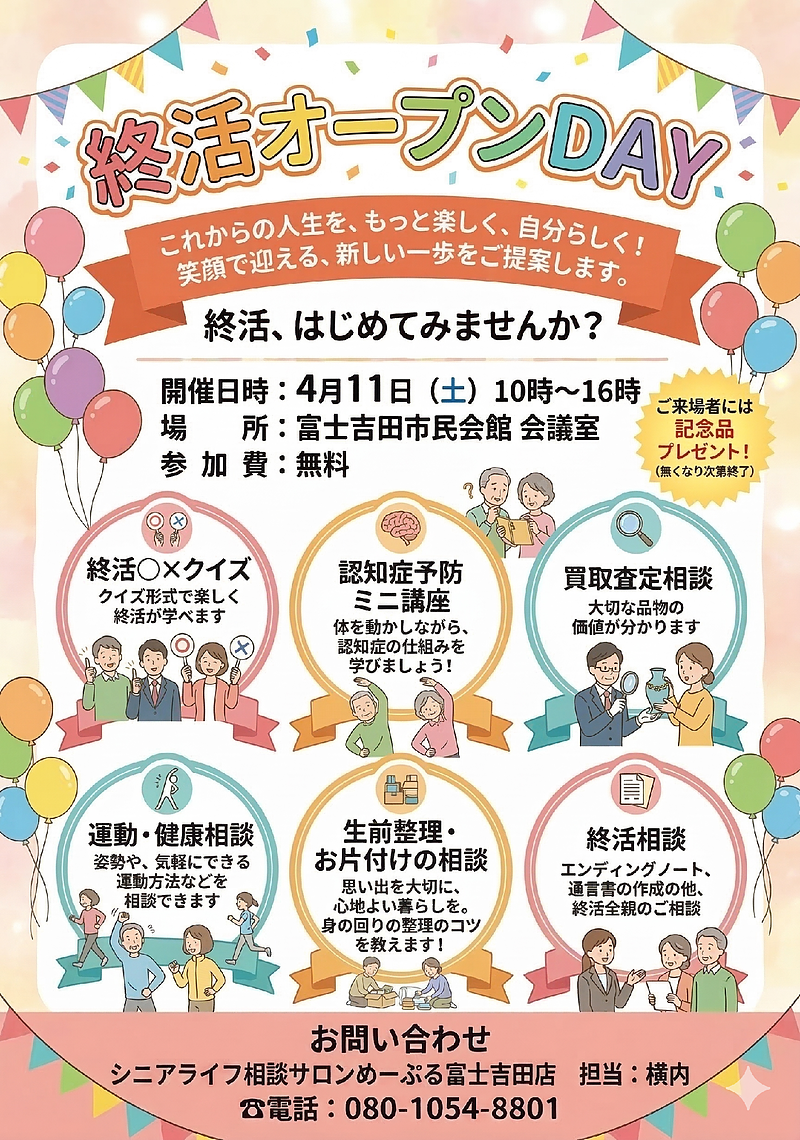 このたび、富士吉田市民会館にて、気軽に終活にふれていただけるイベント